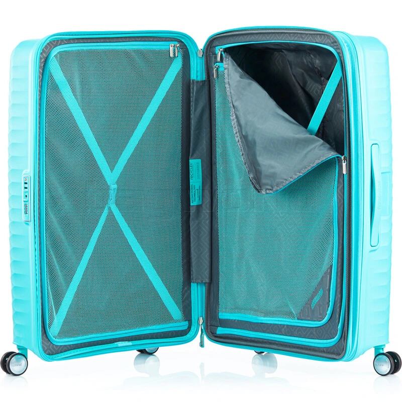 American Tourister Squasem is a strong polypropylene hardside suitcase that includes premium features such as Duosaf™ security zipper for extra protection and Optimov™ shock absorbing wheels to provide exceptional smoothness when rolling on the road. Its design maximises packing capacity so that you can carry everything you need. All sizes include expandability for extra storage space. The recycled and antimicrobial interior lining comes with cross straps, multiple pockets and mesh divider to keep your belongings organised.