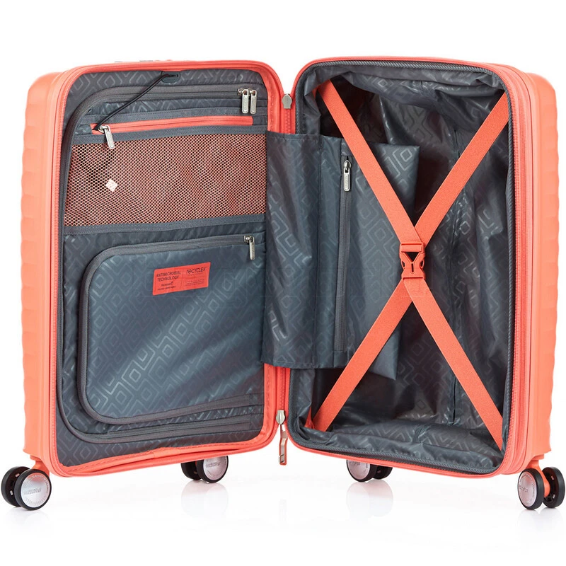 American Tourister Squasem is a strong polypropylene hardside suitcase that includes premium features such as Duosafâ„¢ security zipper for extra protection and Optimovâ„¢ shock absorbing wheels to provide exceptional smoothness when rolling on the road. Its design maximises packing capacity so that you can carry everything you need. All sizes include expandability for extra storage space. The recycled and antimicrobial interior lining comes with cross straps, multiple pockets and mesh divider to keep your belongings organised.