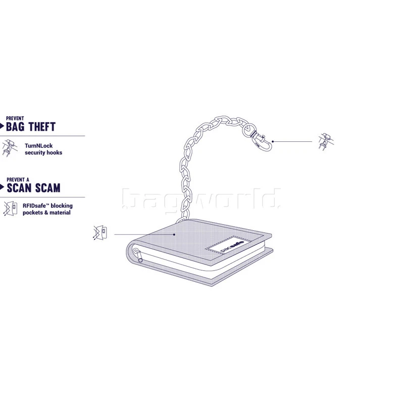 - Detachable metal chain that can be secured to belt loop or attached to the inside of a bag