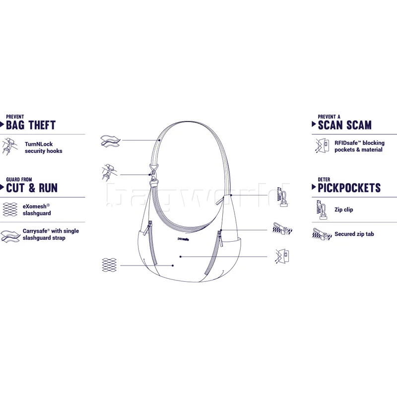 - eXomesh® slashguards – Front, bottom and side fabric body panels of the bag have built in stainless steel wire mesh panels