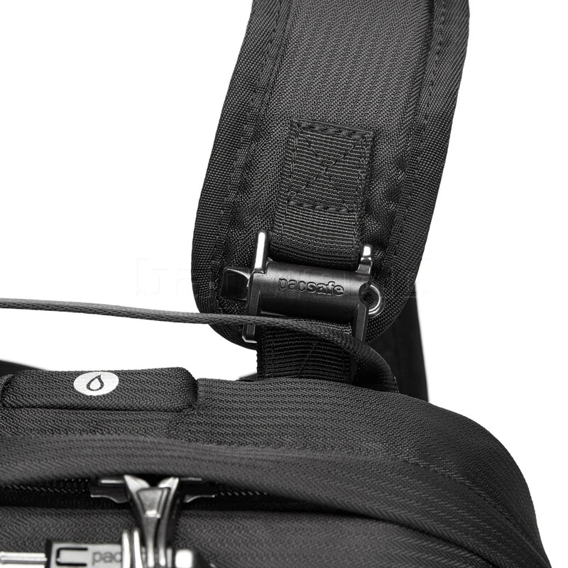 - eXomesh® slashguards – Front, bottom and side fabric body panels of the bag have built in stainless steel wire mesh panels