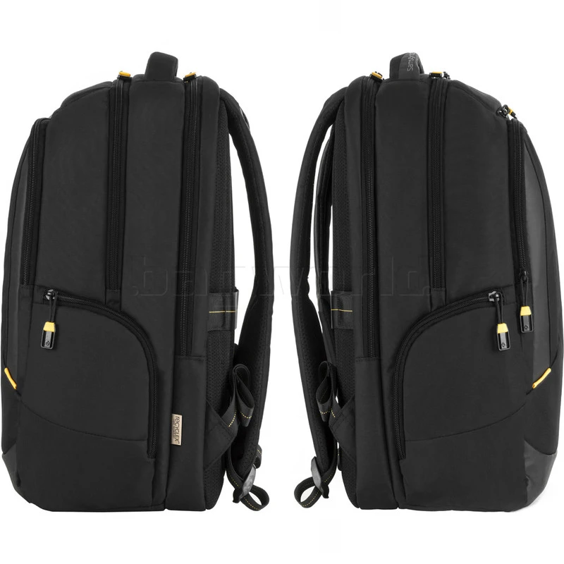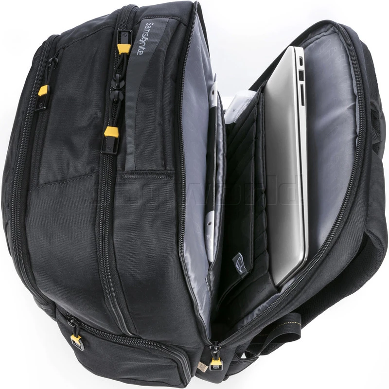 - Rear zippered electronics compartment with padded laptop and tablet sleeves